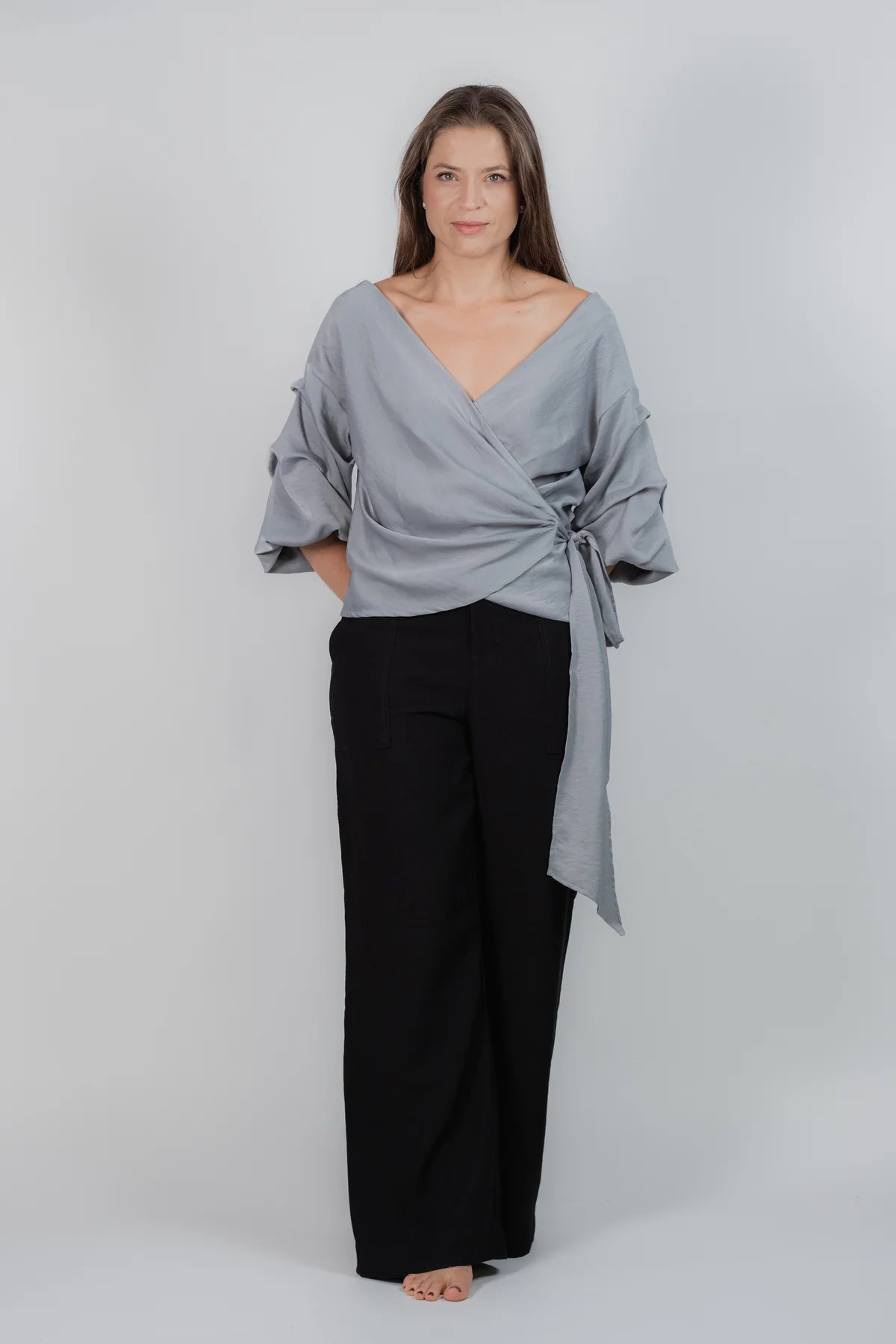 Camisa de ajustar en la cintura, cuello en V, mangas 3/4 con volumen, talla única. Su diseño versátil permite adaptarse a diferentes estilos, úsala sola para un look mas elegante o sobre un top para un look mas casual. Tela ideal que no se arruga.