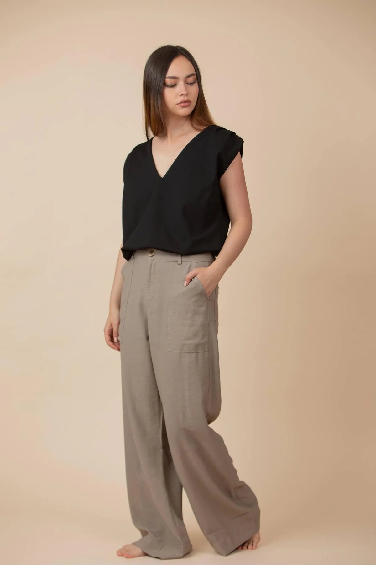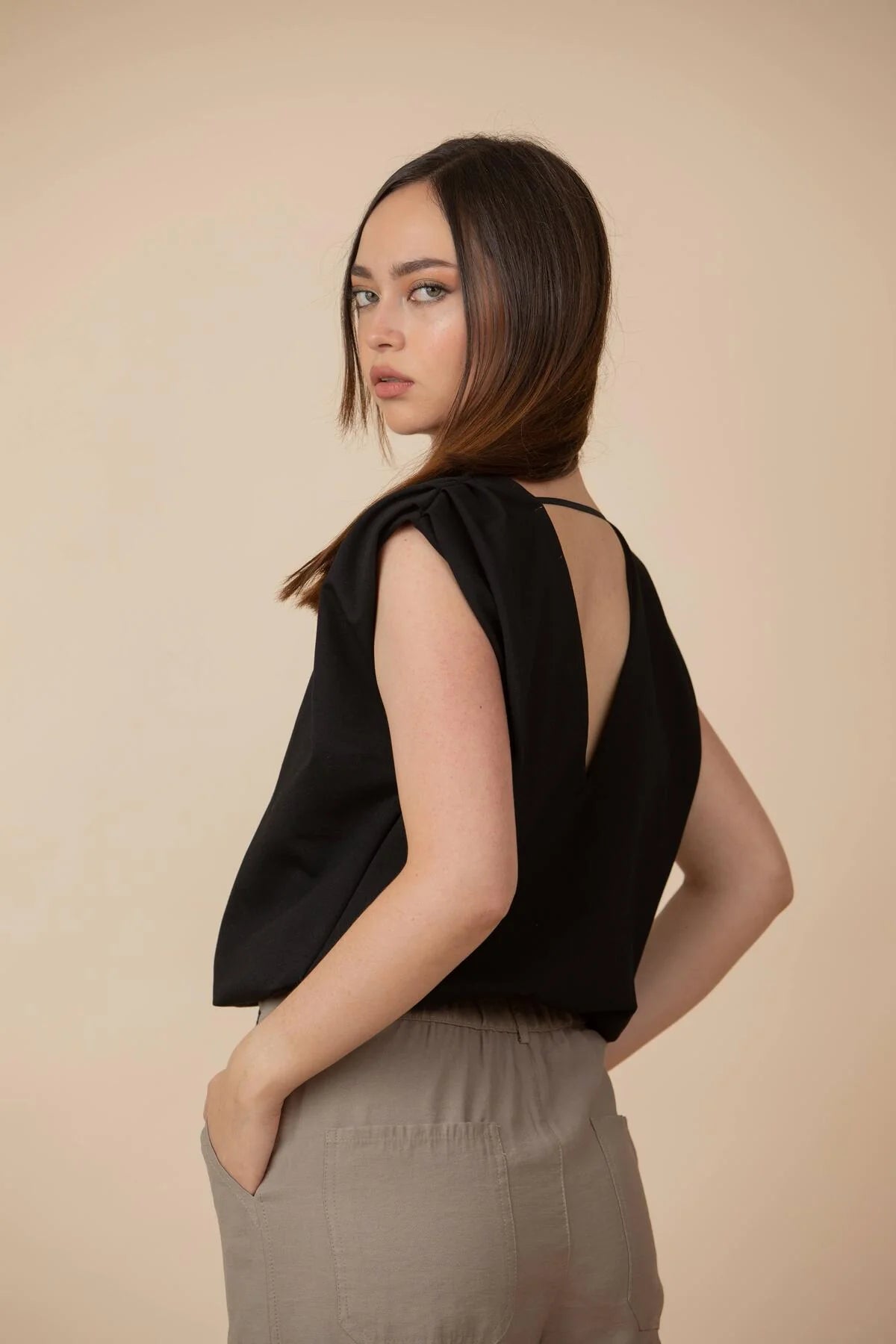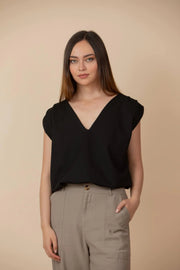Top en 100% algodón, escote en V y manga sisa caída con prenses en hombro y recogido en cintura que realzan la figura. Forro interior en mezclilla. Este diseño ofrece un ajuste cómodo y elegante, ideal para un atuendo formal o casual.