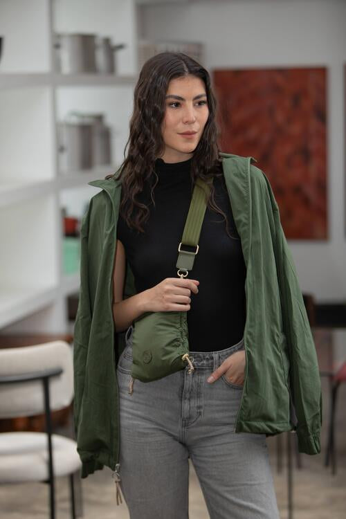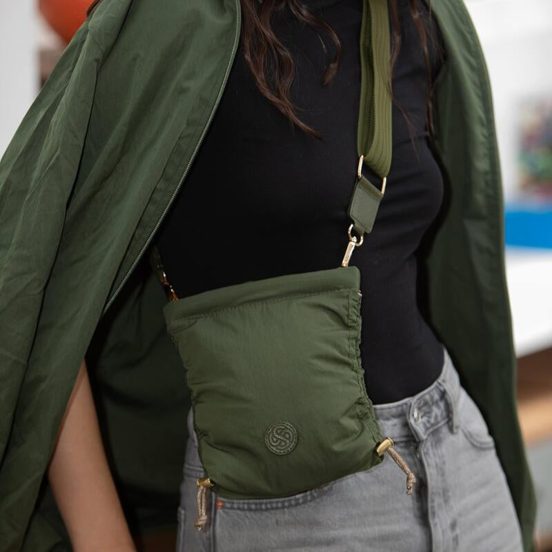 PORTACEULAR AQUA: Cartera pequeña, liviana y muy práctica, hecha en lona repelente al agua acolchada de fácil limpieza, apliques en cuero, con correa graduable en nylon y cordón personalizado Seis Sentidos que se puede graduar para aumentar o disminuir la capacidad.