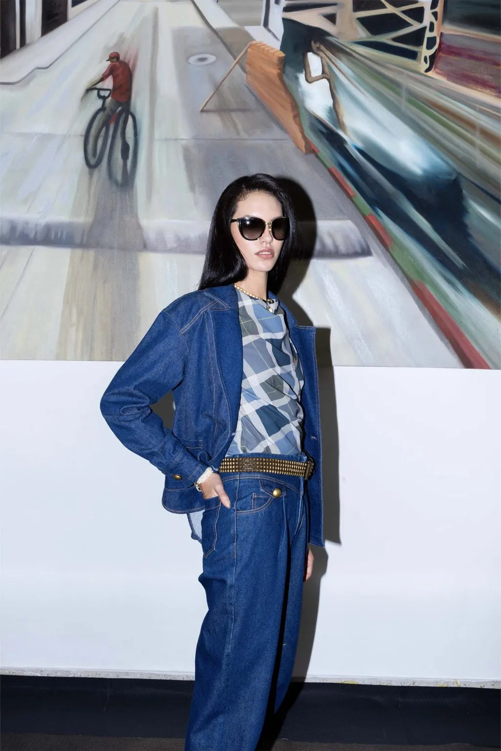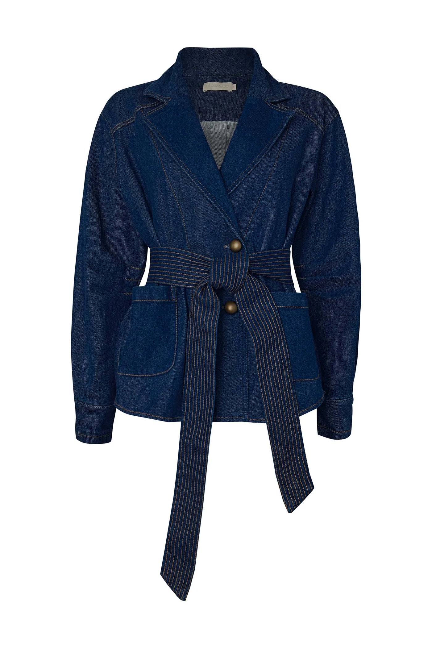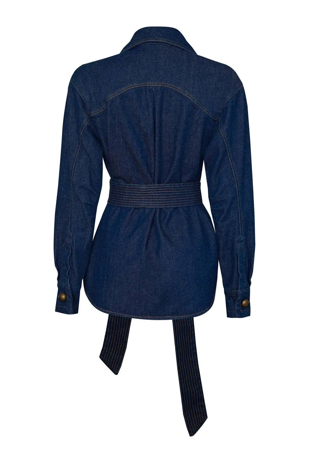 Chaqueta de corte amplio y manga larga, con escote en V que le da un toque moderno. Lleva hilos en contraste que resaltan las costuras y un cinturón con pespuntes visibles que sobresale, marcando la cintura sin perder el estilo relajado.