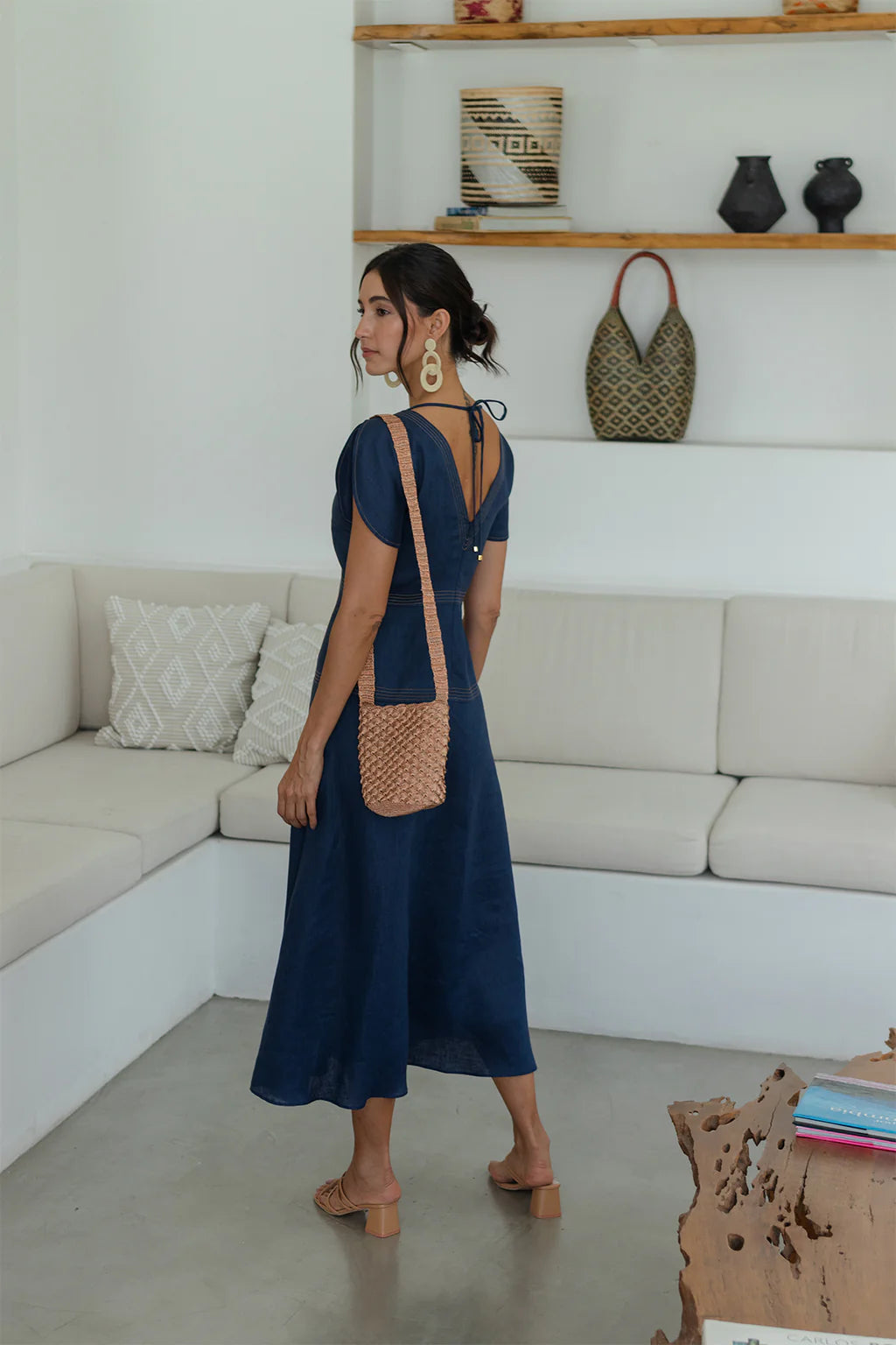 El Vestido Aura es una pieza que combina estructura y ligereza con un diseño contemporáneo. Confeccionado en 100% lino, destaca por su silueta midi en línea A, escote en V y mangas con aberturas que aportan un detalle único y femenino.
