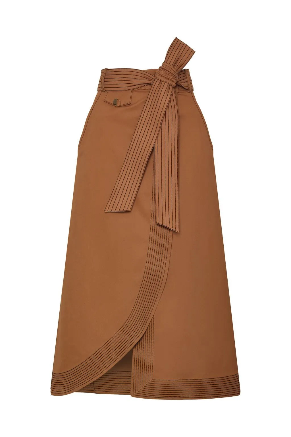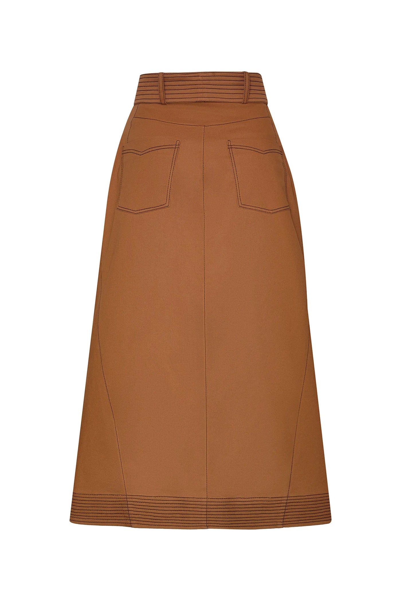 Falda de silueta envolvente y largo midi, diseñada para ajustarse a la cintura con una pretina que incorpora pasadores funcionales, ideales para el cinturón. Tanto la falda como el cinturón cuentan con pespuntes en contraste de color, que realzan su diseño. Incluye bolsillos funcionales laterales y posteriores. Un corte transversal en el costado, que va desde la cintura hasta el dobladillo posterior, añade dinamismo a la estructura. En la parte posterior, presenta una cotilla que aporta forma y ajuste.