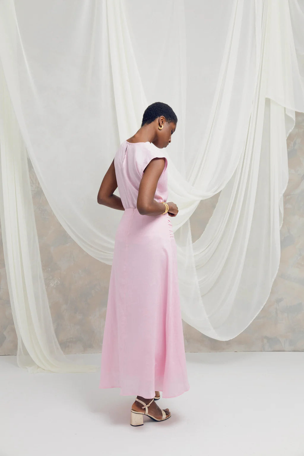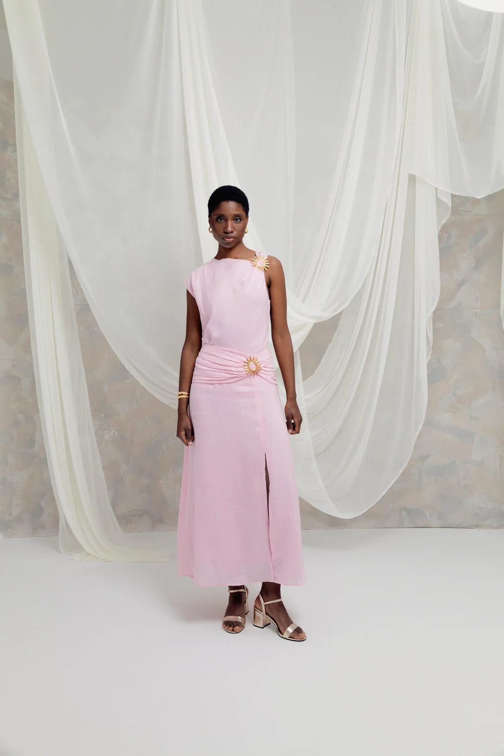 Falda larga en lino rosado con detalle drapeado y broche dorado tipo sol. Feminidad y movimiento en una sola pieza. Diseñada para realzar la silueta con elegancia, esta falda larga en lino combina estructura y movimiento gracias a su corte limpio y su sutil drapeado en la cintura.