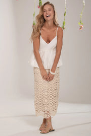 Un básico bohemio con encanto artesanal. La Falda Emery está elaborada en tejido crochet 100% algodón, con un diseño de motivos florales calados que resaltan la textura y el detalle hecho a mano. Su silueta recta y largo midi ofrecen un look fresco y favorecedor, ideal para días cálidos, paseos o escapadas al mar. Tiene aberturas laterales para mayor comodidad al caminar y se adapta fácilmente con tops ligeros o camisas de lino.