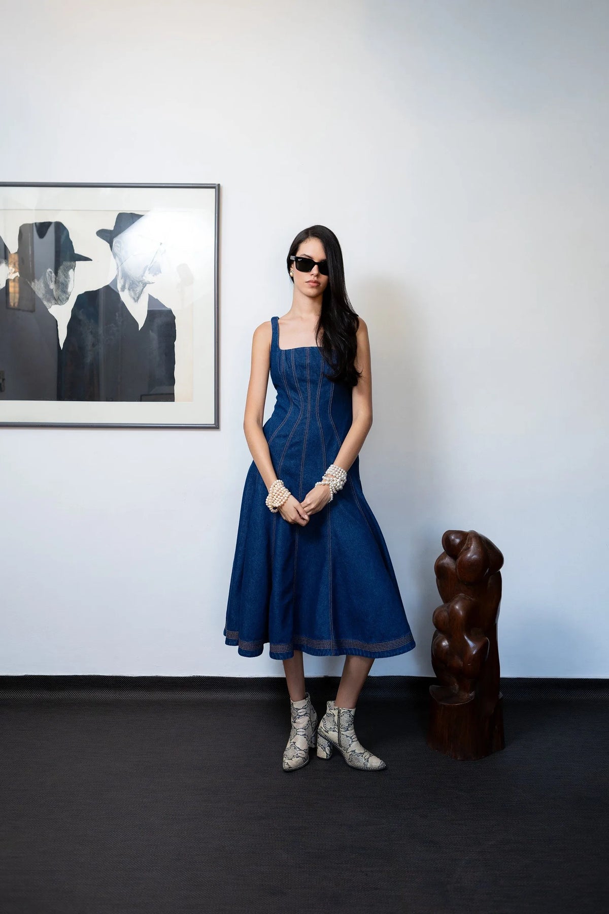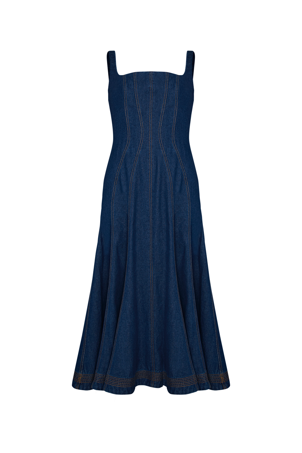 Vestido midi de silueta línea A, ceñido en la zona del busto para realzar la figura. Confeccionado con pespuntes en contraste de color que destacan los detalles del diseño y aportan un toque moderno. Incluye bolsillos funcionales en los costados, combinando estilo y practicidad.