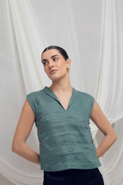 Descripción: Blusa en lino puro con detalle de botones a los costados bañados en oro de 24K. Versatilidad y sofisticación en una sola prenda. Estructura minimalista