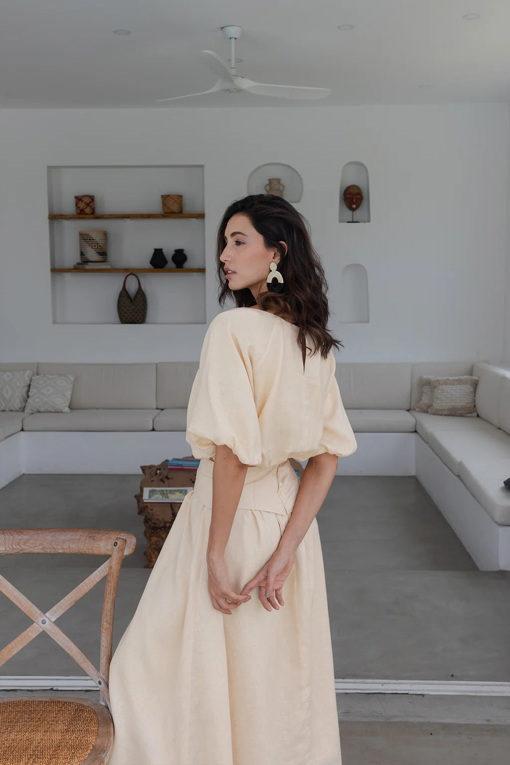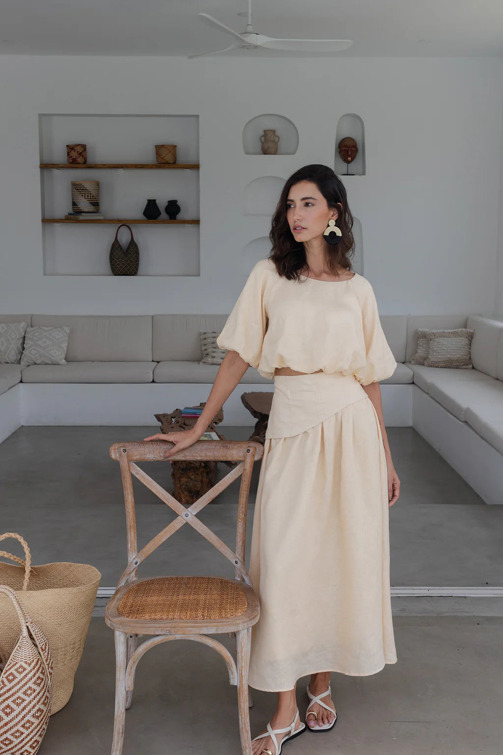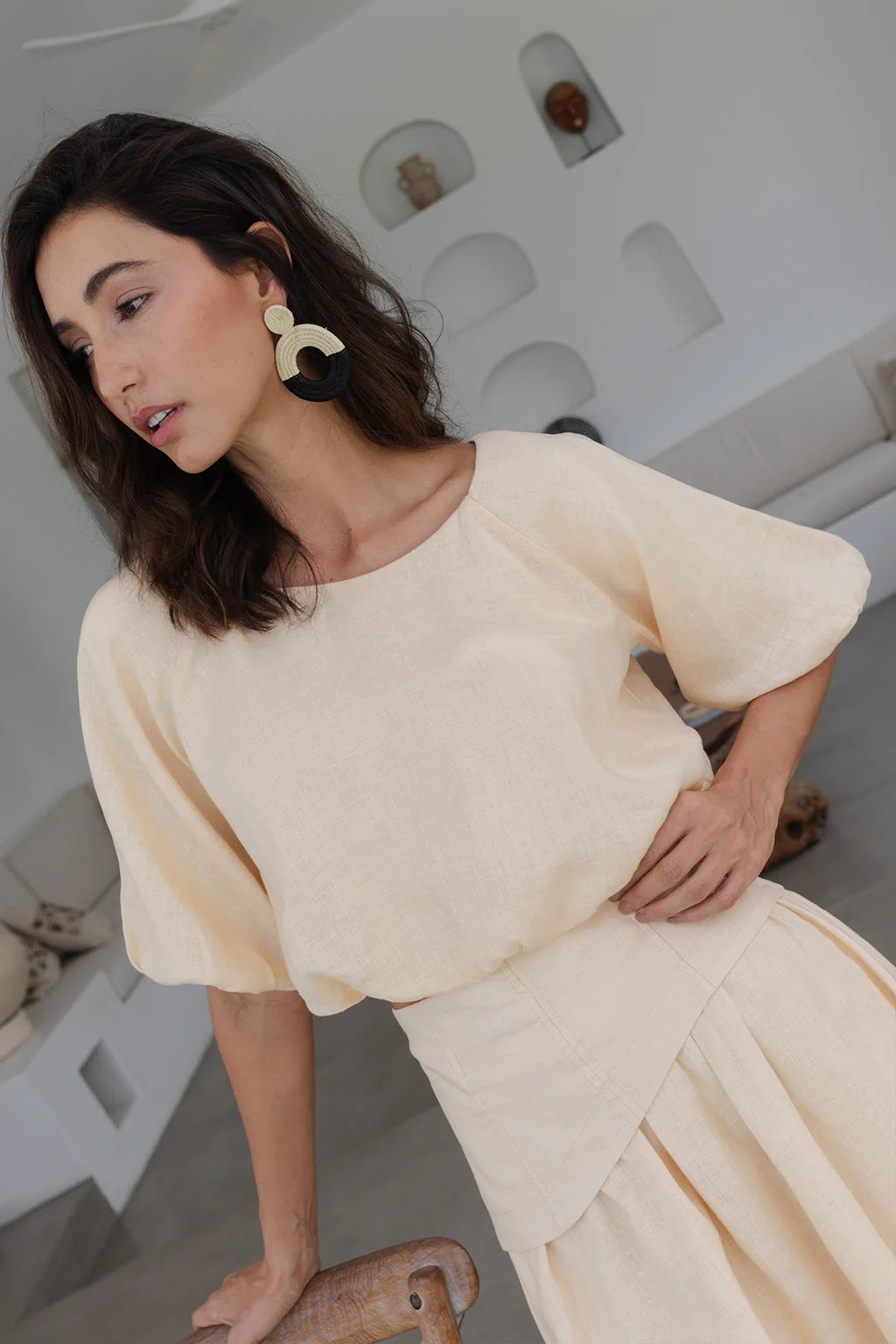 Blusa tipo crop con silueta globo y mangas amplias. Lino puro, diseño fresco y romántico. Hecha en Colombia.