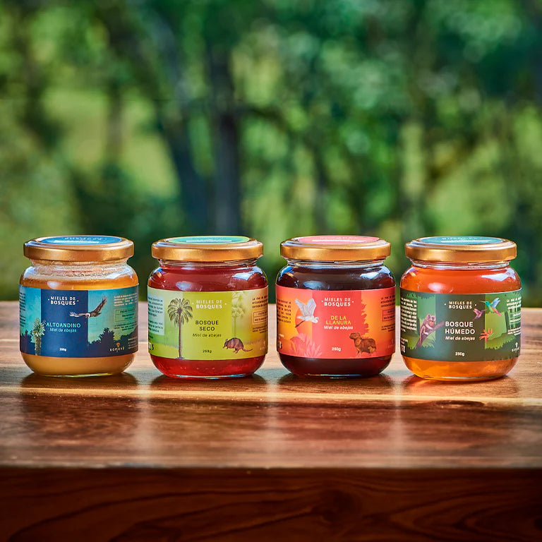 El recorrido comienza por el bosque seco en la Guajira al norte de Colombia, luego vamos a las planicies de los llanos orientales con la miel de las llanuras de Vichada, continuamos con la dulzura floral de la miel de bosque húmedo de Antioquia y finalizamos en el sur del país en el frío páramo de Potosí en Nariño con una miel cremada altoandina.