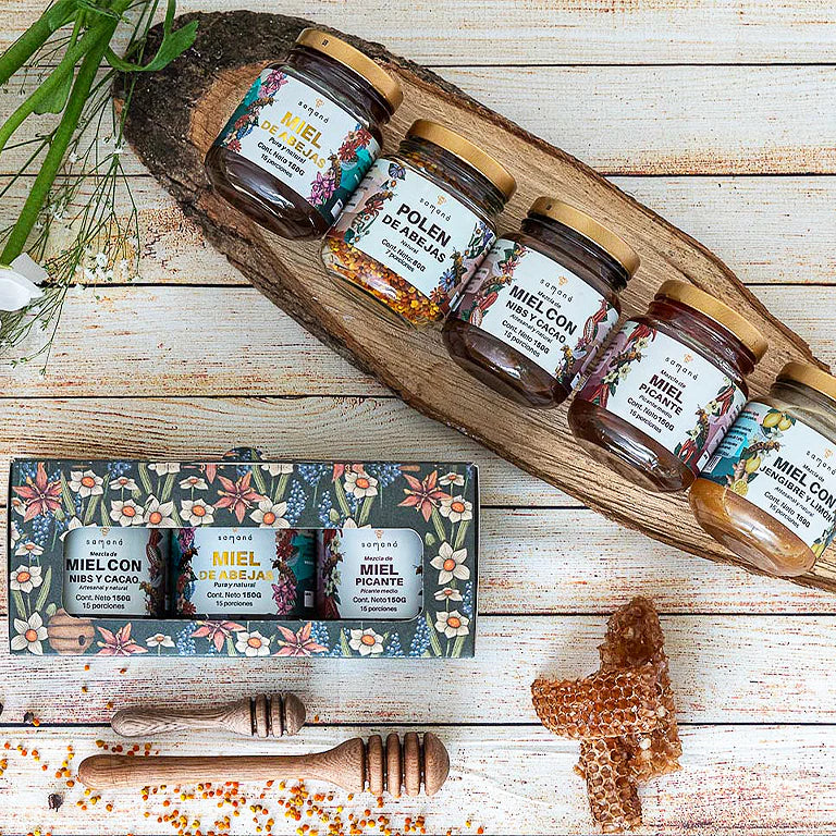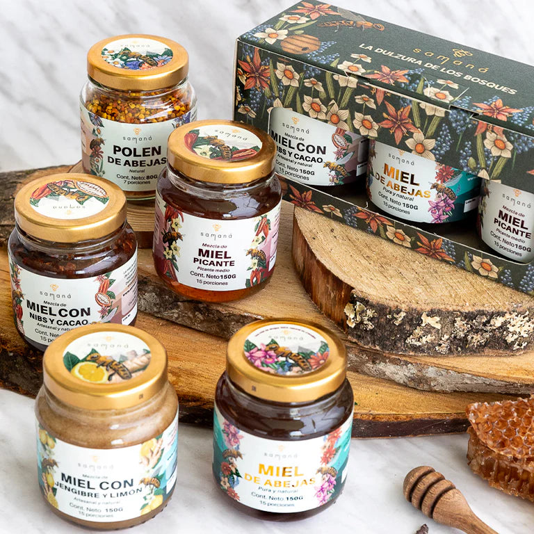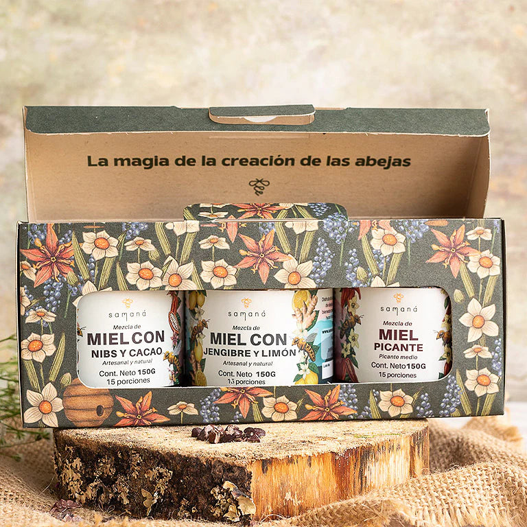 Encontraras: Miel picante 150g, Miel con nibs y cacao 150g, Miel con Jengibre y limón 150g.