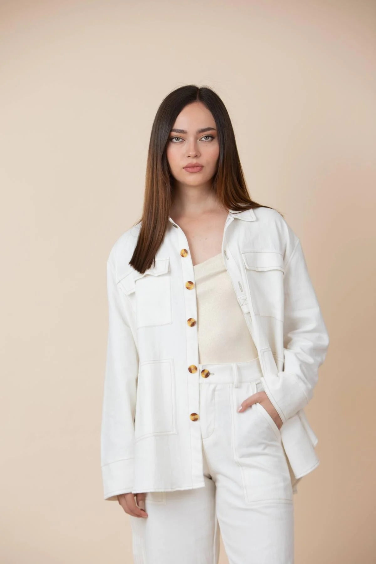 Chaqueta oversize en Lino 50% Algodón 50%, con cuello y manga larga.