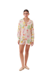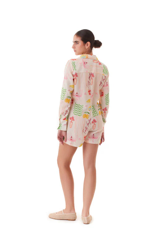 Enterizo corto con cuello Hawai, presenta mangas largas con puños ajustables, tienen botón, en el frente se abre con cremallera invisible, es perfecto para un día de verano. No tiene cortes lo cual convierte la prenda es cómoda y fresca. Su print está inspirado en la mágia de la comida y pintorescos patrones retros.