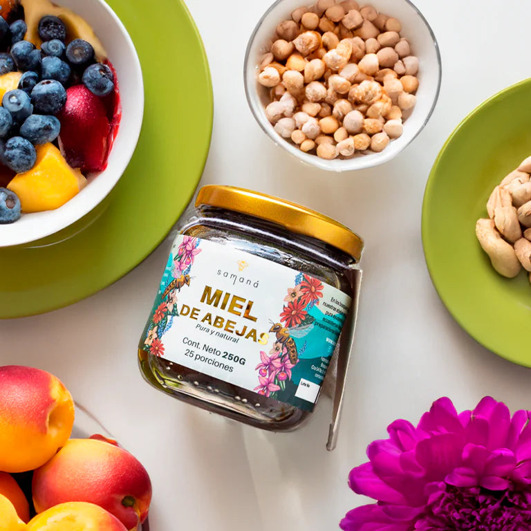 La miel es un endulzante natural creado por las abejas que puedes utilizar como reemplazo del azúcar para tus preparaciones gastronómicas, bebidas, remedios caseros e incluso para la piel pues aporta humectación y brillo natural y el polen es recolectado de las flores por las abejas y lo puedes consumir en batidos, jugos, yogures, cereales, en infusiones o como topping para ensaladas, es una buena fuente de proteína y aporta energía