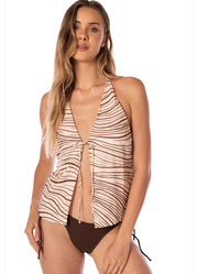 Un top halter ligero con un aire naturalmente chic, el Jenny Top en nuestro estampado Eternal Sands es ideal para días cálidos y encuentros al atardecer. Con un escote profundo en V, abertura frontal con lazo y espalda descubierta con tirantes al cuello, combina sensualidad y frescura. La tela liviana y fluida realza las suaves líneas tipo cebra para un look relajado pero sofisticado, ideal para ir de la playa a la ciudad.